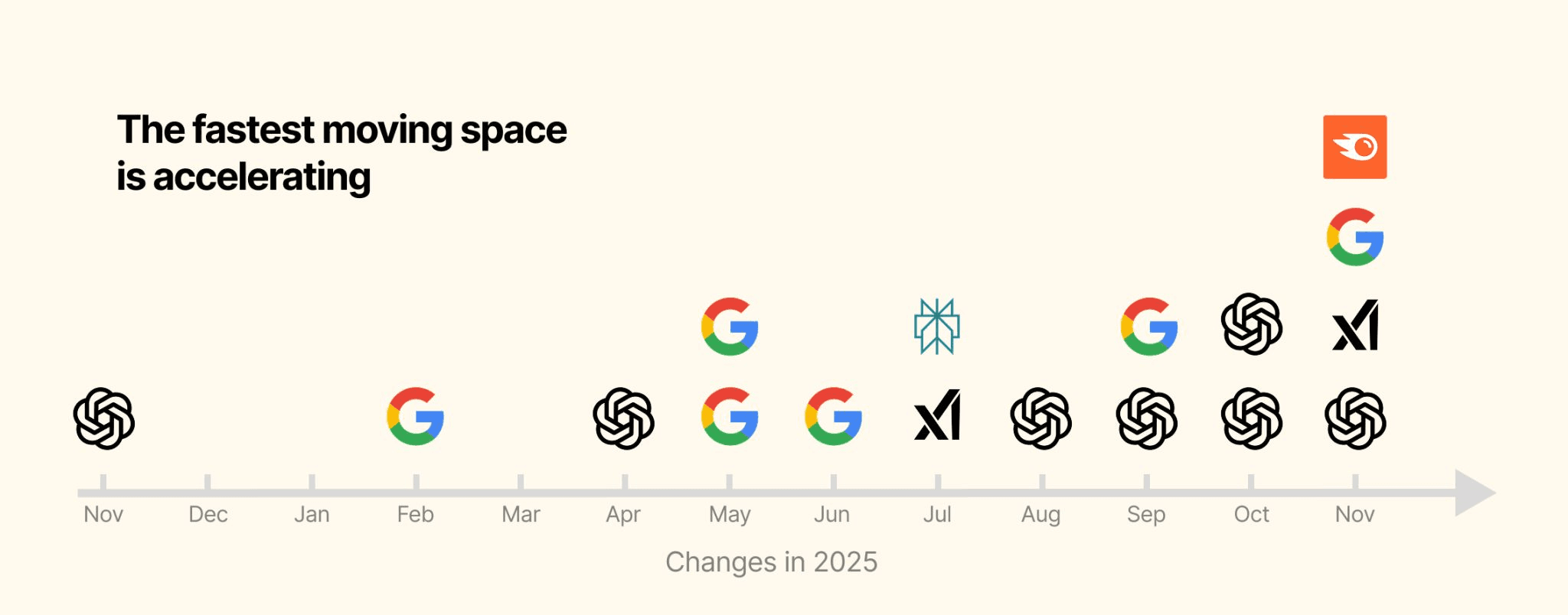 Product releases, funding, and feature rollouts are accelerating, not just more often, but faster in impact. What used to take quarters now happens in weeks: rapid model updates, swift feature launches, and bigger funding rounds compress platform shifts into much shorter windows. Brands must monitor continuously, experiment quickly, and automate optimization to stay visible in AI search.