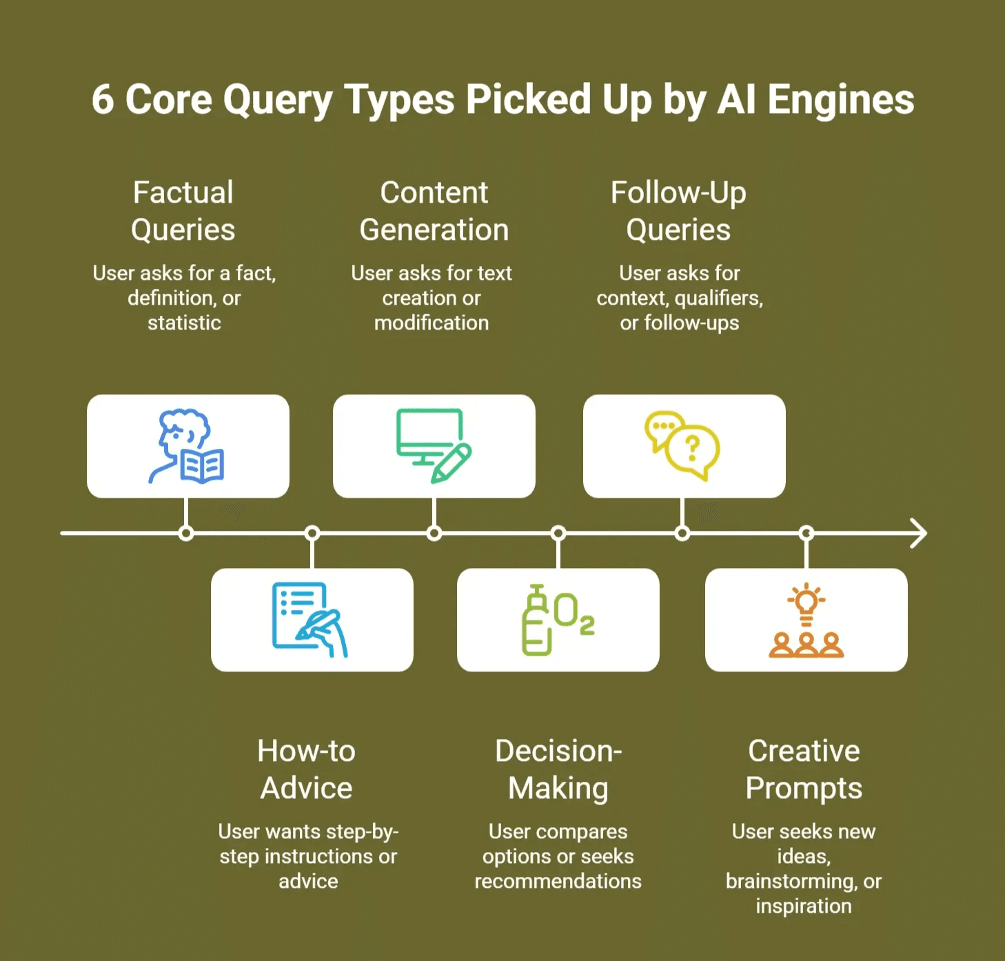AI engines understand natural language queries that include context, intent, and follow up detail. These typically fall into six categories: informational, how to, comparison, writing assistance, ideation, and decision making prompts.